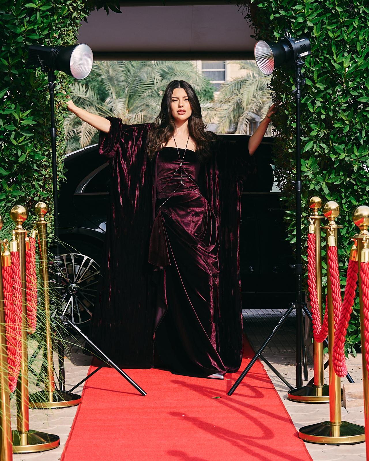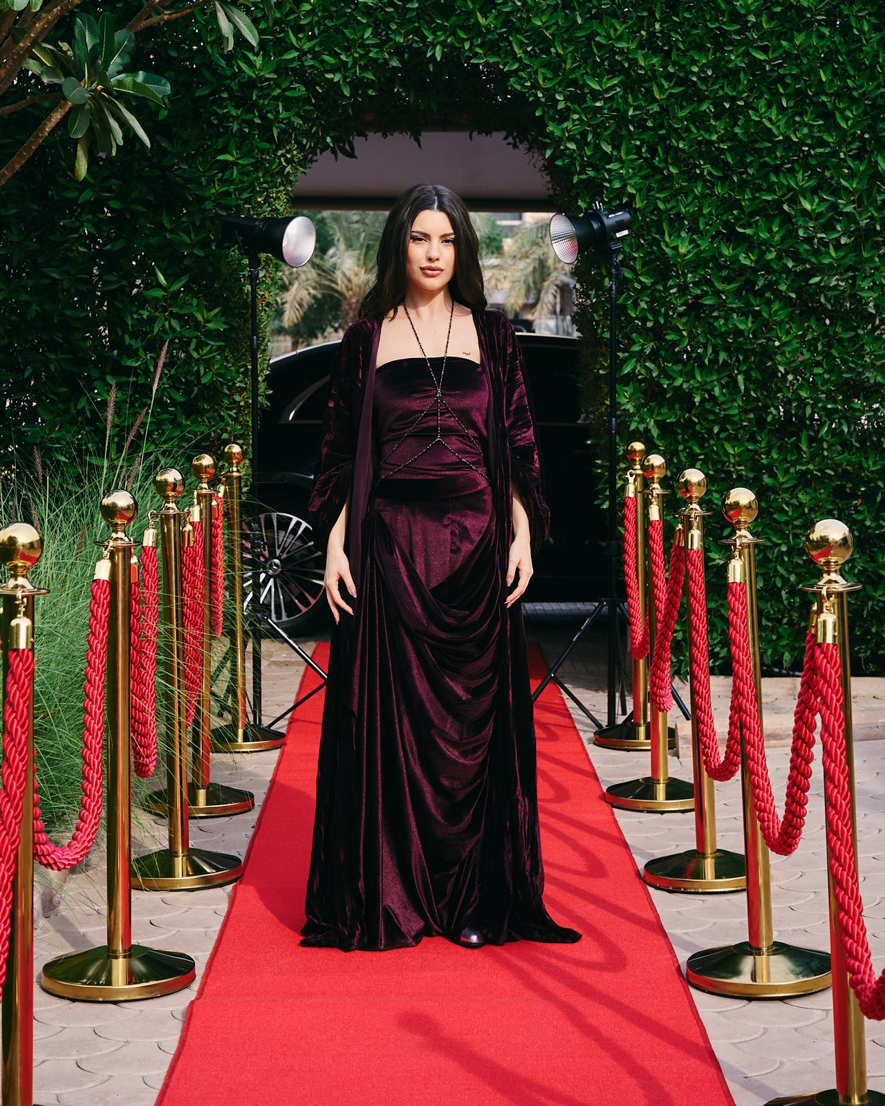 A 3-piece kaftan set: velevt skirt, strechy topand bisht.Ps: Comes with a body chain for an extratouch of glamour.